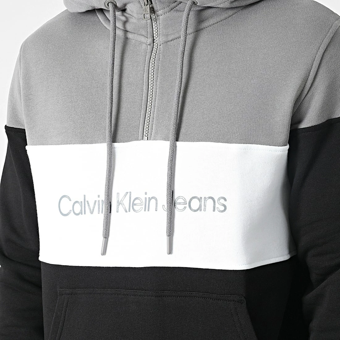 • Sweat col zippé à capuche tricolore imprimé Calvin Klein Jeans à l’avant