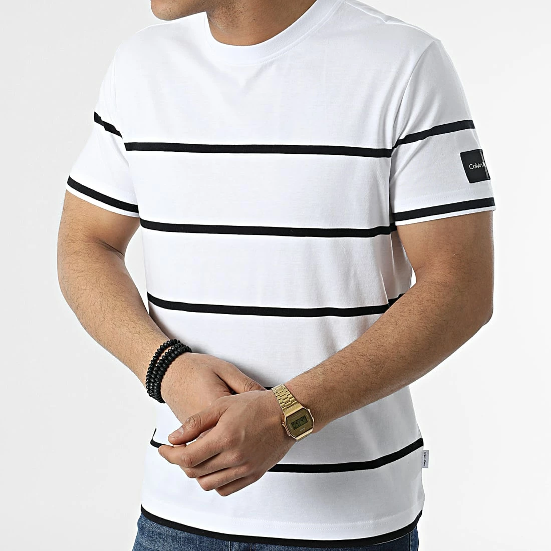 Grosses soldes 🤩 Tee 👚 Shirt A Rayures Striped Badge 9063 Blanc de Calvin Klein 🥰