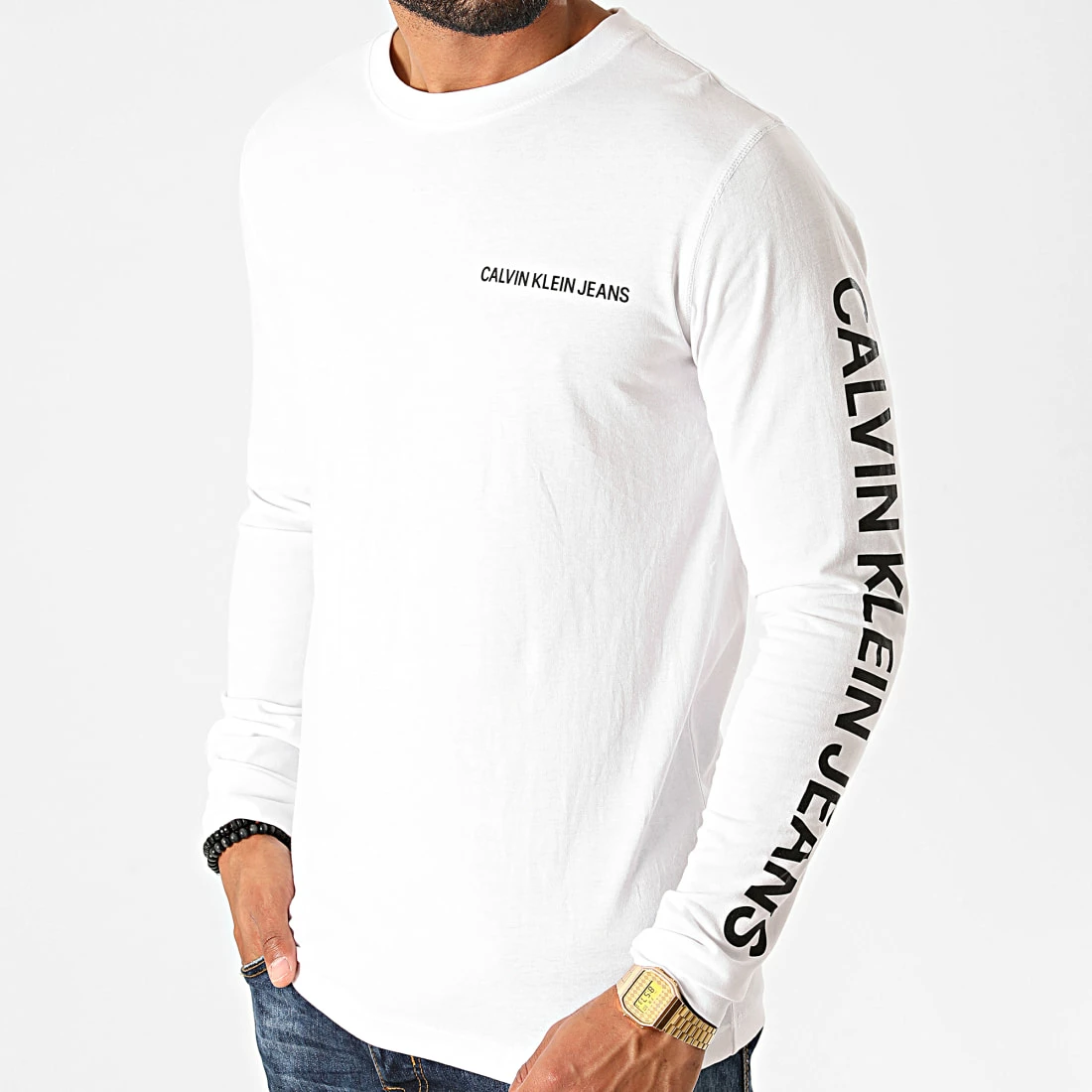 • Tee shirt manches longues en coton léger imprimé Calvin Klein Jeans sur la poitrine et la manche