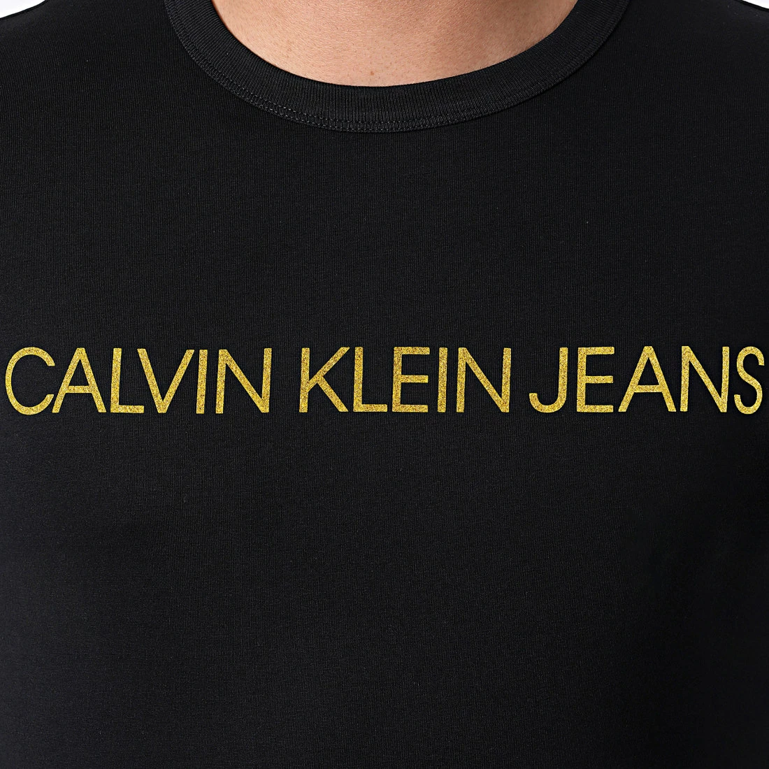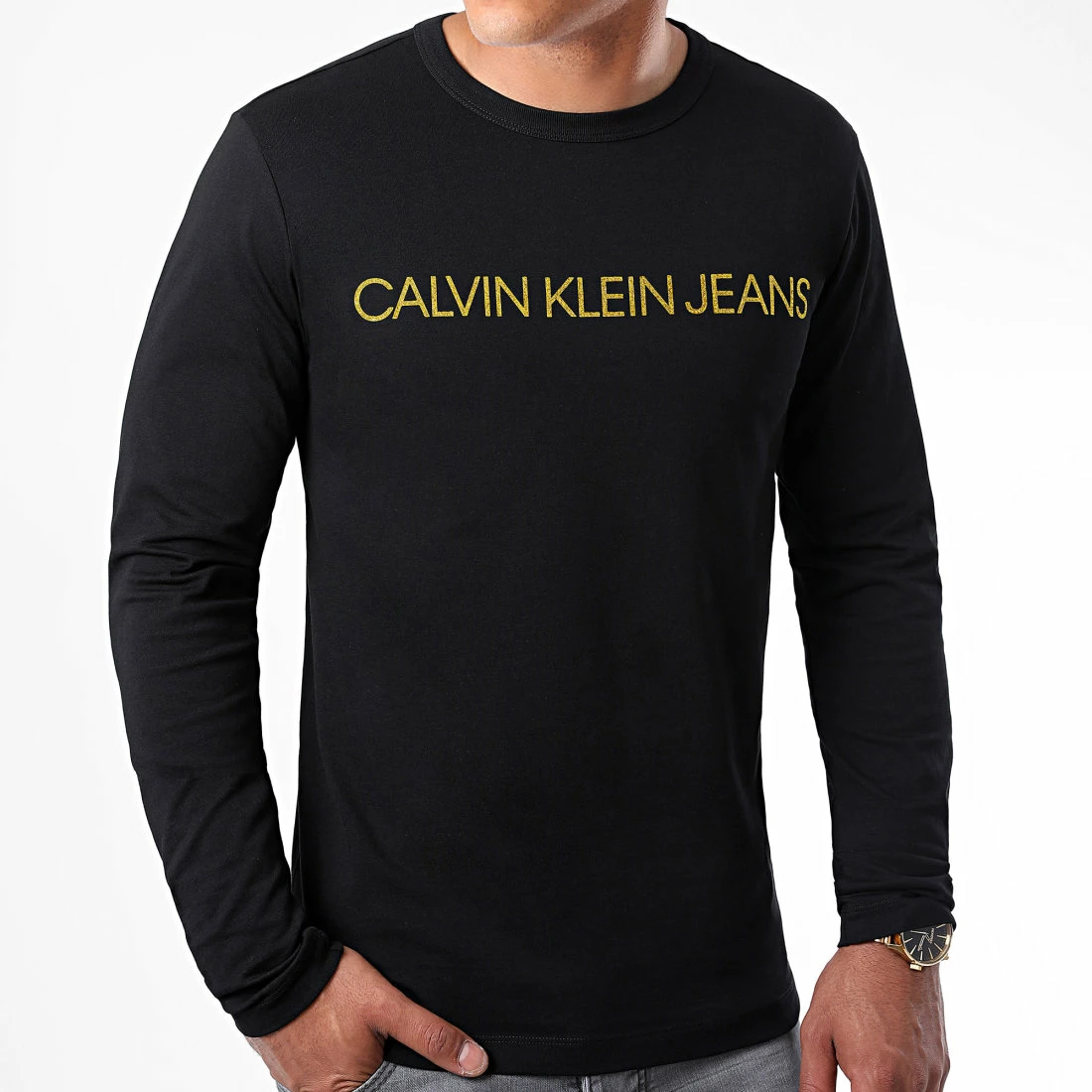 • Tee shirt manches longues en coton stretch léger imprimé Calvin Klein doré sur l’avant
