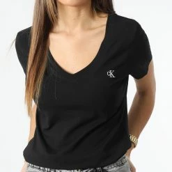 Coupon ✨ Tee 👚 Shirt Slim Femme Col V Embroidery Stretch 3716 Noir de Calvin Klein ⌛